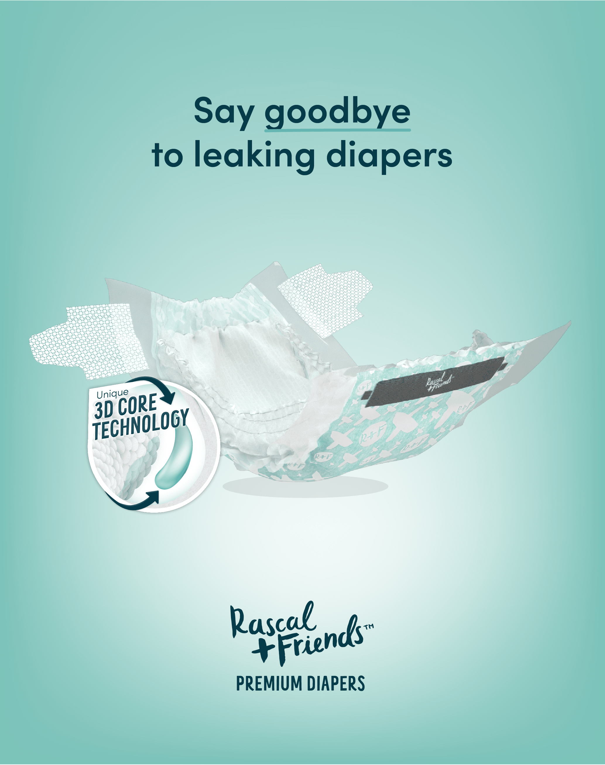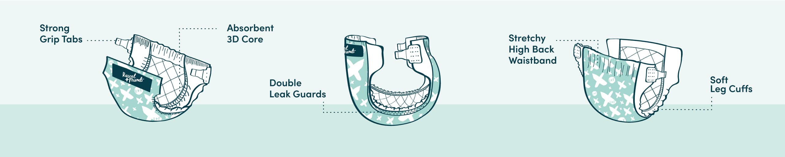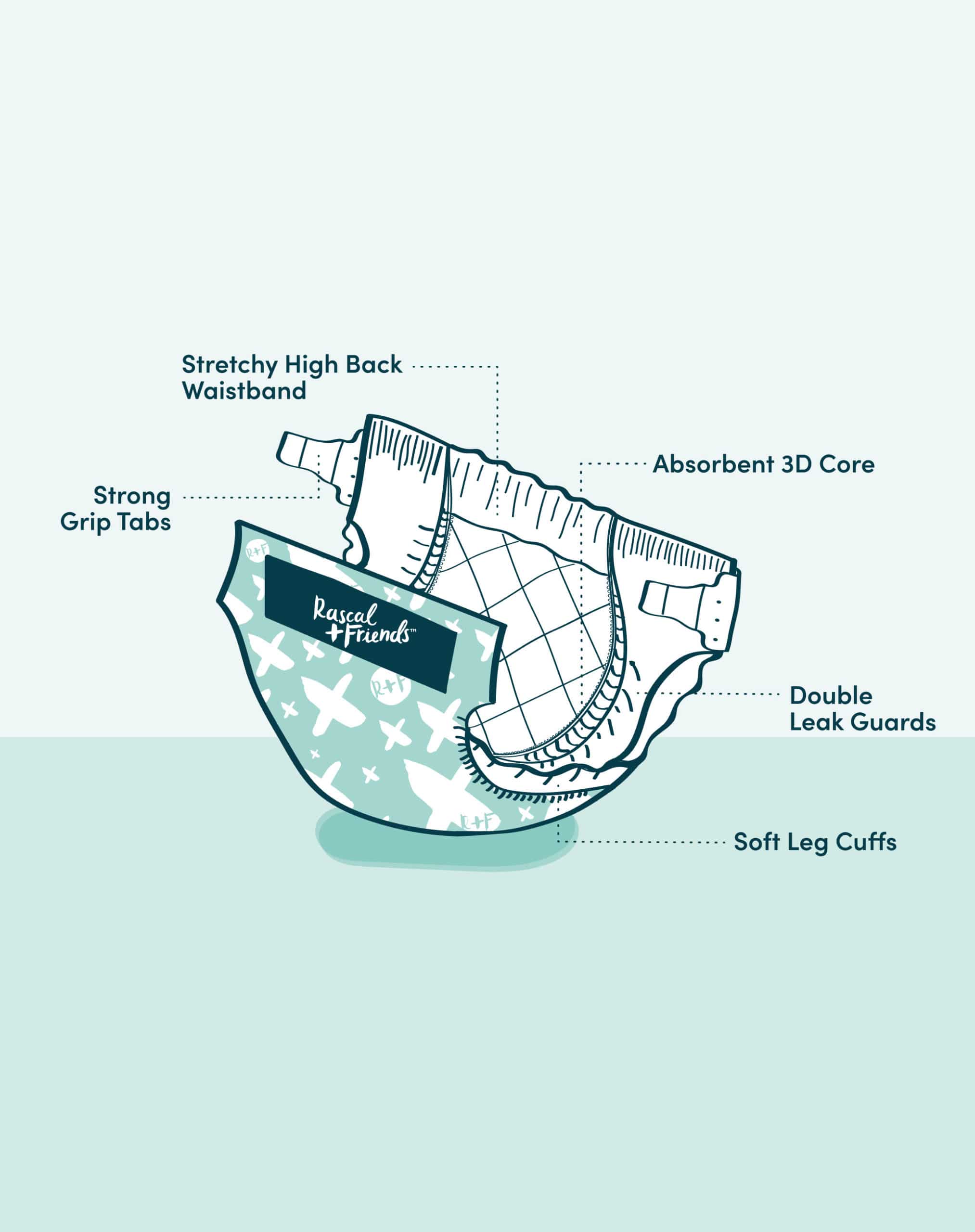 Ensure the diaper tabs are securely fastened on your baby’s hips. Our strong grip tabs are resealable and are designed to sit further apart when fastened onto the front of the diaper. For reference, you should still be able to see the Rascal + Friends logo on the front of the diaper.