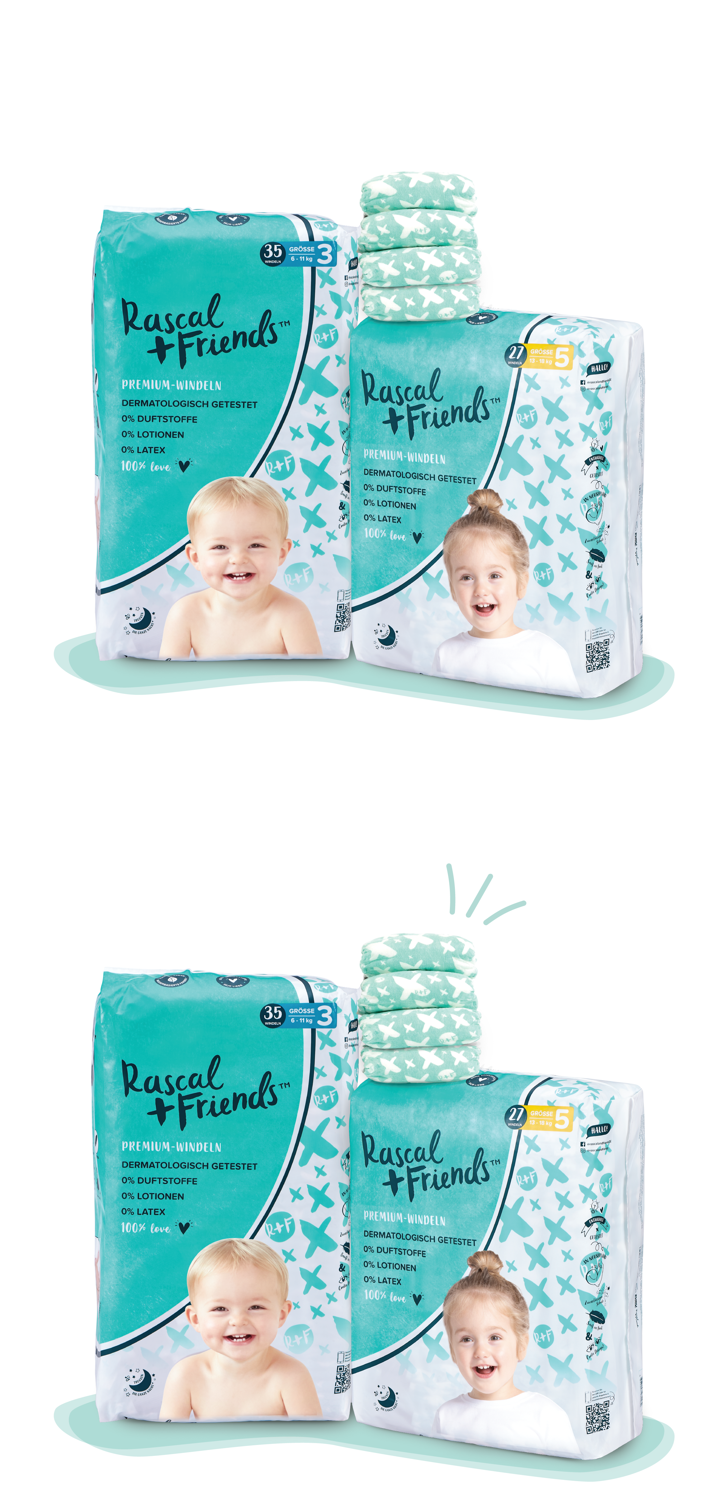 Unsere Premium-Windeln und Pants haben ähnliche Features, wurden aber beide speziell für die Bedürfnisse kleiner Rascals entwickelt. So sind unsere Premium-Windeln mit einem hohen Rückenbündchen und starken Verschlussstreifen ausgestattet, die für eine bequeme und sichere Passform sorgen. Perfekt für Ihren zappeligen Rascal, der noch nicht so weit ist, um herumzulaufen. Unsere Premium Pants hingegen sind mit einem dehnbaren Bündchen, leicht aufreissbaren Seiten und einerm wiederverschließbaren Klebestreifen ausgestattet, um das Wickeln zu erleichtern. Perfekt für Ihr energiegeladenes Kleinkind oder für den Beginn vom Töpfchentraining. Lesen Sie hier mehr über die Eigenschaften unserer Windeln und hier über Pants.